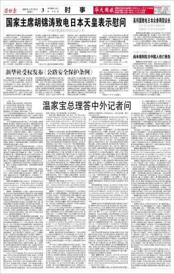 新华社北京3月14日电 日本东北部地区11日下午发生里氏9级特大地震和海啸灾害,造成重大人员伤亡和财产损失。13日,全国人大常委会委员长吴邦国就此致电日本众议院议长横路孝弘和参议院议长西冈武夫,代表中国全国人大常委会,向日本人民表示诚挚慰问,对遇难人员表示深切哀悼。