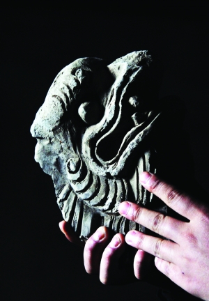 这是3月17日拍摄的老司城考古中发掘出土的一只兽头石雕。