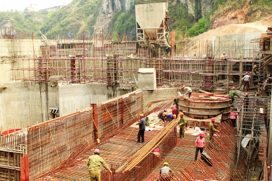3月30日,花垣县竹篙滩水电站建设工地一派繁忙,中国水电八局的施工人员正在砌筑发电机厂房。竹篙滩水电站是湘西州招商引资重点项目,首期工程投资2.5亿元,装机容量3.3万千瓦,首台1.1万千瓦机组将于今年5月投入营运。 龙艾青 摄