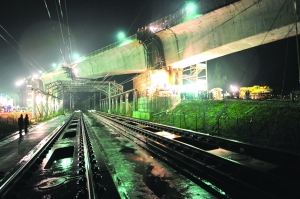 4月3日凌晨,我国首座跨高铁特大桥连续箱梁成功转体。 当日凌晨,位于湖北省咸宁市横沟桥镇的我国首座跨高铁特大桥———武咸城际铁路跨武广高铁特大桥两边各重达4500吨的连续箱梁实现成功转体,为武咸城际铁路的按期通车奠定了基础。 武咸城际铁路跨武广高铁特大桥全长1483.534米,主跨80米连续箱梁斜跨武广高铁,与营业线夹角为155°。由于武广高铁行车密度大,在施工中,中铁十一局集团一公司通过搭设安全防护棚架,加强安全教育和值班巡检等举措,确保了该桥的施工安全及武广高铁的运营安全。 新华社记者 杜华举 摄 |