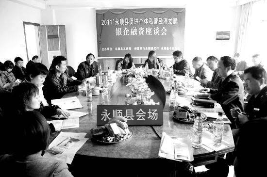银企合作劈新路,工商搭台保民生。3月30日,永顺县工商局将城区内的30位个私业主代表和永顺邮政银行负责人召集起来,举办了“2011年永顺银企座谈会”,为县内的个私业主与邮政银行搭建资金供需平台,努力营造良好的创业发展环境,积极推进全民创业。 刘文化 陈龙 摄