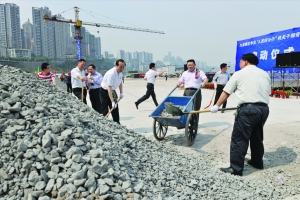 当日,为庆祝“五一”国际劳动节的到来,重庆市九龙坡区党、政领导和机关干部300余人来到九龙外滩广场与建筑工人一同劳动,拉开了争当“人民好公仆”系列活动的序幕。 新华社记者 陈 诚 摄