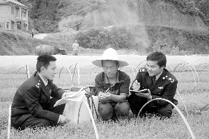 古丈县工商局充分发挥职能作用,紧紧围绕“爱农、护农、帮农”这一要务,组织工商干部深入乡镇农村,与农资经营户签订目标管理责任书,建立了“两账两票一书一卡”种子留样备查等制度。图为4月29日,古丈县工商局干部在罗依溪镇石碧村田间,向村民石宗平调查春耕春播生产情况。