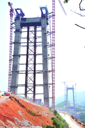 在建的张花高速路中,连接永顺与张家界、规模仅次于矮寨大桥的澧水河特大悬索桥,从去年6月开工以来,目前已进入建设高潮期,准备迎接火箭发射大桥先导索。该大桥的主跨度虽然只有856米,但谷底与桥面高差400米左右,比矮寨大桥330米还要高。此外,大桥先导索抛送施工工艺为我省首次采用的火箭发射方式。图为5月6日永顺县8标段施工现场。