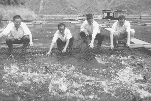 龙山县隆头镇残疾人姚茂成是移民户。2006年在里耶片区隆头信用社的大力支持下,他建起了高标准的养鱼网箱38口,引进美国叉尾 鱼等优质鱼种,科学喂养,来势十分喜人,今年养鱼收入预计可达30多万元。图为5月8日,里耶片区信用社主任彭心跃(右二)到网箱上与他分享丰收的喜悦,共谋养鱼发展宏图。