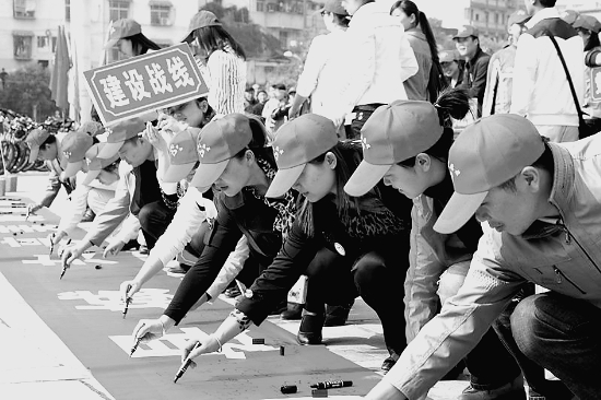 永顺县在整脏治乱工作中,充分发挥青年生力军的作用,全县2000多名青年志愿者积极参与城乡环境综合治理工作。图为5月4日,全县各条战线的青年在开展“汇聚青春力量,共建宜居永顺”签名活动中签名。 向水生 摄