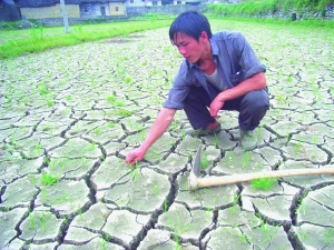 今春,雨量较往年偏少,加之近期持续高温,地处易旱区域的凤凰县禾库镇旱情严重。该镇14500多亩稻田有三分之二以上没水犁,秧田大部分近于脱水。插秧在即,干部群众火速奔赴田间抗旱。图为开裂的稻田。