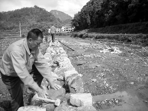 5月23日,永顺县吊井乡民工正在修砌河堤。该村河堤修建于上世纪70年代,多处垮塌。随着汛期即将来临,该县农业局和发改委计划在该村修建高标准河堤137米,确保该村千亩农田不受洪水侵害。