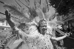 5月29日,一名男士参加在美国旧金山举办的狂欢节大游行。