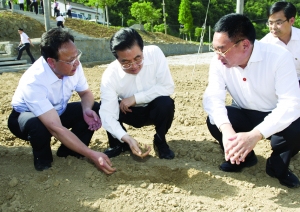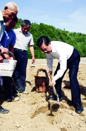 在位于十堰市东部的丹江口市土关垭镇龙家河村,胡锦涛走进一片受旱严重的农田,用手翻开田里的土壤查看墒情。一位上了年纪的村民告诉总书记,这里好久没下过一场透雨,流经村子的小河几十年都不曾缺过水,如今却断流了。得知村里现在正把插不上秧的水田改成旱地,抢种玉米、花生、大豆等耐旱作物,胡锦涛走上前去,亲自刨土、点种、舀水、浇地,和村民一起补种玉米。总书记希望乡亲们精心搞好抗旱田间管理,能补种的尽量补种,能改种的抓紧改种,努力把损失降到最低程度。胡锦涛又特别叮嘱当地干部,现在是抗旱的关键时刻,要把抗旱作为当前农村工作最紧迫的任务,动员各方力量,采取综合措施,加大资金、物资、技术等方面的保障力度,确保人畜饮水,确保不误农时,坚决打赢抗旱这场硬仗。