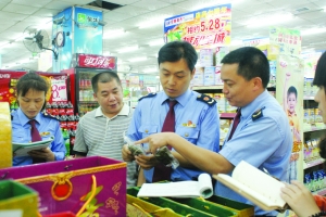 为了确保端午节期间的食品安全。6月初,凤凰县工商局在全县范围内开展了专项食品整治行动,确保人民群众过上安乐、祥和的节日。截至目前,共出动执法人员136人次,检查食品经营主体570户,检查食品添加剂生产经营主体2户,下架“无标签”粽子22公斤,当场纠正未按规定填写进销货台账行为15起,有效维护了端午节食品市场经营秩序。图为6月2日,该局执法人员在该县某超市检查粽子。 王彩霞 摄