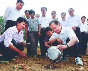 在老河口市洪山嘴镇杨家湾村的玉米地里,几位村民正在点播玉米。温家宝蹲下身子,帮着给玉米浇水。他告诉村民们,昨天夜里在宜昌和随行的部门负责人开会决定中央财政拿钱,给旱区农民发放抗旱补助,帮助大家抗旱。听到这个好消息,大家都高兴地鼓起掌来……