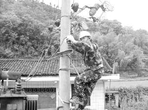 雷雨季节来临,保靖县电力局组成检查组深入全县各个乡镇,对电力设备进行安全巡视和检查,排除隐患,确保供电安全可靠。图为6月7日,该局技术人员正在清水坪镇夕东村检查变压器的防雷设备。