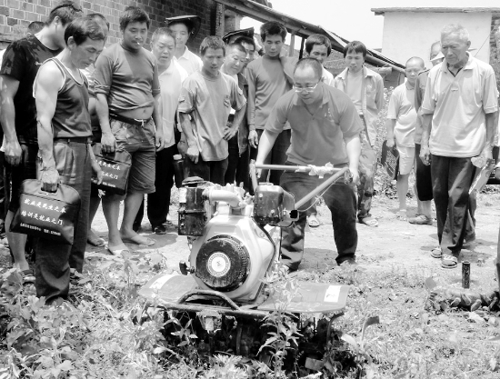 6月8日上午,“永顺县农村劳动力转移培训拖拉机培训班”,在首车科技培训学校开班。这次培训班由县就业中心和县金果柑橘专业合作社共同举办,旨在加强该县农村实用技术培训和转移技能培训,帮助参训学员实现有效稳定地就近就地转移就业。参训的70多名学员,在农技师的指点下,进行理论和实地操作学习。图为培训班师生在田间地头进行旋耕机的示范与操作。 吴晓敏