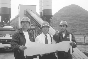 花垣县花垣镇农民贾祖兴2010年在该县信用联社的大力支持下,筹措资金2000多万元,建起了“兴菊建材有限公司”,在花垣第一个引进混凝土一条龙环保生产作业线。一改传统混凝土作业风险高、劳动强度大的落后局面。图为6月14日该县信用社信贷经营部经理龙建华(中)与贾祖兴(左一)共同谋发展大计。