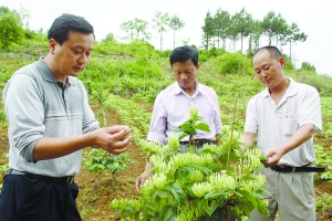6月14日,在龙山县三元乡青岗村的“巩固退耕还林成果后续产业建设金银花高产示范基地”里,长势良好的金银花开满山野。村支书向家义介绍,金银花种植4年后开始受益,由于培管到位,该基地里的金银花仅3年就开始受益,当地农民纷纷加入金银花种植队伍,县食缘蔬菜农民专业合作社因势利导,采取“入股分红”、“租地返聘”等方式,引导农民抱团发展,确保农民得实惠。
