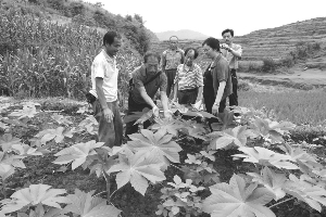 湘西自治州605生物能源科技开发有限公司致力于我州及湘鄂渝黔边区生物能源的开发利用,今年在四省市边区发动农户试种生物能源植物蓖麻新品种,并为农户提供种子及种植技术支持。目前试种的2000多亩蓖麻新品种长势良好,为明年大面积推广扩种打下良好的基础。图为该公司组织技术人员为种植农户实地传授蓖麻的培管技术。