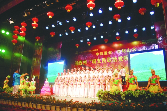 6月23日,由州委州政府主办的“唱支民歌给党听”歌咏比赛总决赛在湘西大剧院举行,14支队伍各展特色,演绎了深厚的少数民族文化底蕴,用精彩的演唱,为党的90岁生日献上厚礼。图为古丈代表队正在演出。 本报记者 田宏贵 摄