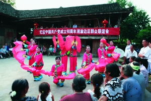 6月26日,保靖县清水坪镇坝木村、重庆市秀山县保安乡龙家村土家族群众聚集在龙家村举办“纪念中国共产党成立90周年湘渝边区群众联谊会”,以民族歌舞的形式歌颂党的政策给民族地区带来的新变化。