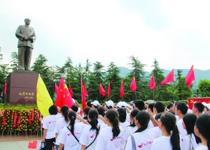 7月6日,“红色青春”助学活动资助的40名我州寒门学子,在韶山齐集一堂,向毛主席的铜像致敬,并许下学有所成,报效社会的诺言。 张 军 摄