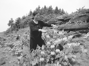近年来,凤凰县两林乡板交村因势利导,在荒坡地上种植经济作物,成为远近闻名的富裕村。图为7月6日,该村农户在丰收的山坡上采集金银花。