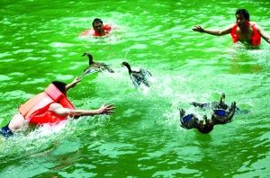 暑假来临,我州旅游市场火爆,各景区游客猛增。7月11日,游客开心地在花垣县补抽乡大龙洞景区河里捉鸭子,捉鸭子是大龙洞景区很有特色的旅游项目。 本报记者 彭 伟 特约记者 龙艾青 摄