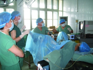 微创技术的引进是该科室建设发展的一个里程碑。自2001年以来,科室送出几批骨干到广州等地的医院学习微创技术,多次邀请全国知名的微创专家来院手术示教,逐渐独立开展经皮肾取石等微创手术,并带动全院微创技术的发展。目前,在后腹腔镜技术的运用方面取得了较为突出的成绩,开展了后腹腔镜肾部分切除术、后腹腔镜单纯肾切除术、后腹腔镜包膜下肾切除术、后腹腔镜肾盂癌根治术、后腹腔镜输尿管松解术、后腹腔镜肾盂输尿管成形术、后腹腔镜肾上腺囊肿去顶减压术及肾上腺肿瘤切除术等多项技术,为群众带来了福音。传统的肾脏手术方法,会在患者腰部留下一道15-25厘米长的伤口。运用后腹腔镜技术,微创手术无须开刀,只需在患者腰背部刺穿3个小孔,腔镜器械从这些孔道中进入体内,然后将腔镜通过孔道深入到这个腔的空间内,腔镜内的摄像头会将腔隙内的图像同步传输到电脑屏幕上,医生就通过内窥镜结合观察屏幕上的图像来完成手术。手术结束后,只需在患者背部的小孔口缝上几针,贴上一张创可贴就行了,几乎不会留下疤痕,3-5天便可完成检查、治疗、康复全过程,降低了传统手术对人体的伤害,极大地减少了疾病给患者带来的不便和痛苦,具有创伤小、疼痛轻、恢复快的优越性。微创治疗率达93%,能完成各类型微创和腹腔镜手术,涵盖泌尿外科手术90%以上,湘西州人民医院泌尿外科手术逐渐进入一个全新的“微创时代”。