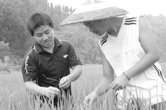 6月中旬以来,泸溪县合水镇组织农业技术服务队,深入村寨来到田间,结合水稻每个生长期特点,根据农民朋友遇到的难题,指导农户做细水稻田间管理,科学防治病虫。 图为7月14日,合水镇农技人员正在该镇新桥村稻田里教授农户防治病虫害。 唐正海 摄