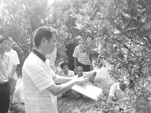 7月20日,吉首市双塘镇农技站工作人员正在对该镇柑橘技术人员和 柑大户代表进行柑橘夏季培管现场讲解。柑橘是该镇主导产业之一,为进一步帮助农民增收,该镇农技站工作人员现场为大家讲解柑橘施肥、修剪、病虫防治以及防止干旱的措施,并做现场示范,受到大家的一致好评。