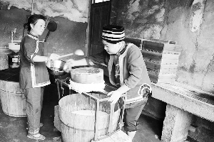 龙山县洗车河镇壮大豆制品加工产业,每年创收上千万元,同时带动了当地的黄豆、花椒、辣椒等特色产业的发展,助当地老百姓奔富路。图为7月26日石磨豆腐加工大户彭敏在磨制精品豆腐。