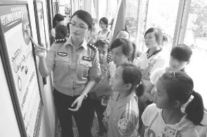 7月29日,泸溪县梁家潭学校的15名学生在“女警护学中队”中队长张艳的指导下观看交通警示图片展,学习道路交通安全知识,感受警营生活。