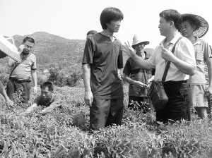 7月26日,保靖县蔬菜办技术员毛振超(前右),顶着酷暑高温,深入到该县复兴镇那甫村辣椒基地,为村民讲解辣椒抗旱培管技术,深受百姓欢迎。