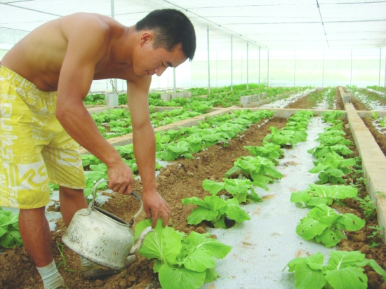 图为2011年7月29日,永顺县高坪乡马鞍村村民彭国春在烤烟大棚内给蔬菜加工施肥。他今年在烤烟大棚内育一季烟苗,种一季蔬菜,双收过万元。 唐其柏 田 伟 摄
