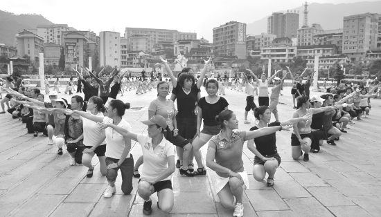 图为8月4日早晨,永顺金秋文艺健身队在排练健身操,备战8月8日(全民健身日)全县举办的全民健身活动大赛。 唐启武 摄