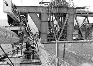 8月9日,在离地面高达350多米的吉茶高速矮寨特大悬索桥施工现场,技术人员正在检查和维护钢桁梁“轨索滑移”架设系统。目前,该大桥桥面钢桁梁架设进入最后冲刺阶段,将于本月底贯通。