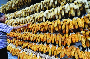 9月1日,在湖北省宣恩县沙道沟镇药铺村,一名农民在整理挂在吊脚楼外的玉米棒。