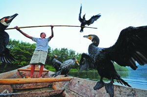 9月3日花垣县边城镇渔民曾祥书在清水江上用鱼鹰捕鱼。