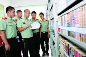 武警花垣县中队在该县县委、县政府的大力支持下,经过一年多的建设,先后投入40万元对“执勤、训练、文体、生活”设施(即“四项设施”)进行改造,改善了营区条件,营区面貌焕然一新,为中队战士营造了很好的工作、生活环境。图为9月9日, 战士们在新建的图书室里学习。