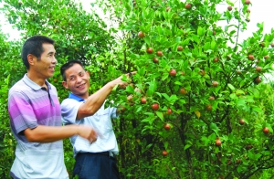 近日,保靖县水田河镇孔坪村两名村干部在低改油茶地里查看油茶树挂果情况。近年来,该村在县林业局的大力扶助下,利用山地资源大搞油茶低改,今年,已低改过的750亩油茶树挂满“金果”。