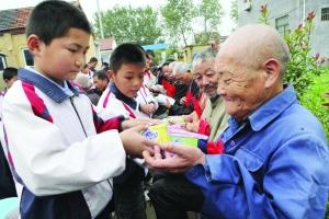江苏省赣榆县赣马镇敬老院的老人收下怀仁爱心中队队员送上的节日礼物(9月29日摄)。 重阳节前夕,江苏省赣榆县怀仁爱心中队的小队员们来到赣马镇敬老院开展尊老敬老服务活动。新华社发(司伟 摄)