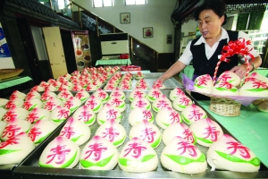 10月4日,北京老字号护国寺小吃店员工在装寿桃礼篮。 10月5日是我国传统节日重阳节,一些老字号加紧赶制寿桃、重阳糕等节日食品,满足市场需要。新华社发(陈晓根 摄)