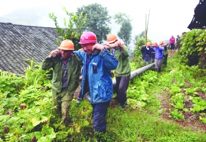 9月28日,施工队冒雨在龙山县猛必乡车拉坪村抬电杆。该县启动新一轮农网改造升级工程,今年实施改造的行政村达到86个,超过历来实施的总和。改造完成后,农村的电能质量将大幅提升。