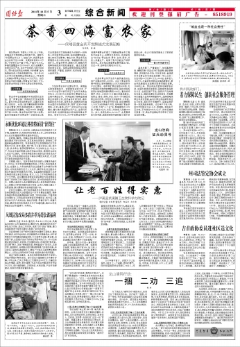 本报讯(记者 赵 欢)9月29日,吉首市政协部分委员深入马坡岭社区,开展以“争当文明人、共创文明城”为主题的委员进社区活动,居民与政协委员的互动让州公路局球场热闹非凡。 社区居民组成的新悦艺术团,为大家表演了一场精彩绝伦的文艺节目,一曲《好日子》拉开了活动的序幕,花鼓戏《白蛇传》让周围的群众过了一把戏瘾。委员们为居民们精心准备的“生活问题”有奖竞答题,把活动推向了高潮。活动进行的同时,由湘西丽人医院友情赞助的大型慈善义诊也吸引了不少居民前来就诊。 州市共建共管为政协委员进社区活动搭建了平台,为委员发挥作用扩展了空间,委员们感慨地说:“现在月月有活动,时时能作为,担子更重了、责任更大了、工作更实了、热情更高了。” |