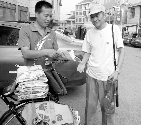 唐泽福中专毕业后被分配到永顺县线带厂,因没有工作岗位,一直在广州打工。2008年初他回到永顺县,被该县邮政局聘为邮递员。从此,他在邮路上风雨无阻,为群众服务,深得订阅报刊单位和个人的好评。图为9月28日早晨,唐泽福在给锻炼归来的老人送报。 唐启武 摄
