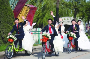 当日,山东聊城市7对新人举行自行车集体婚礼,迎亲队伍由近百辆自行车组成。这种健康环保、时尚快乐的绿色出行生活方式吸引了众多市民驻足观看。