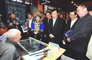 刘云山与凤凰县民间老艺人亲切交谈,了解传统文化传承与发展情况。