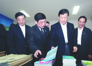刘云山翻阅由团结报社主编的《民族报业》杂志。