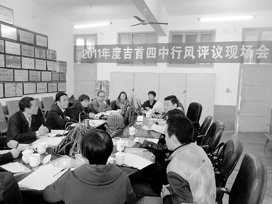 近年来,吉首四中在行风建设中,扎扎实实地开展相关的评议、整顿、完善工作,力争把学校办成人民满意、领导放心、师生舒心的素质教育模范学校。10月26日,吉首市教育局纪检监察室及乾州地区的市人大代表、政协委员及相关人士代表对该校进行了行风评议,总评满意率为百分之百。 余 斌 摄