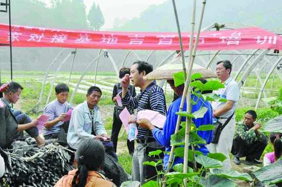 由省人社厅、省扶贫办、省财政厅联合组织开展的为贫困地区搭建科技平台培训和咨询项目,是建设新农村,培养农村实用技术人才,造就新型农民的具体举措。该项目在吉首市实施3年来,推动现代农业技术进村入户,促进了农村经济迈上新台阶。图为近日,省农业大学园艺园林学院刘明月教授在马颈坳镇隘口蔬菜基地,给农民讲授蔬菜种植新技术。 肖运军 摄