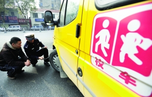 ▲11月18日,湖北武汉市石乔口区交警(右)在检查校车。当日,武汉市石乔口区交通大队联合石乔口区教育局,对辖区内幼儿园的18辆校车进行安全检查,逐一落实各项交通安全措施,确保学生乘坐安全。 新华社发(史 伟 摄)